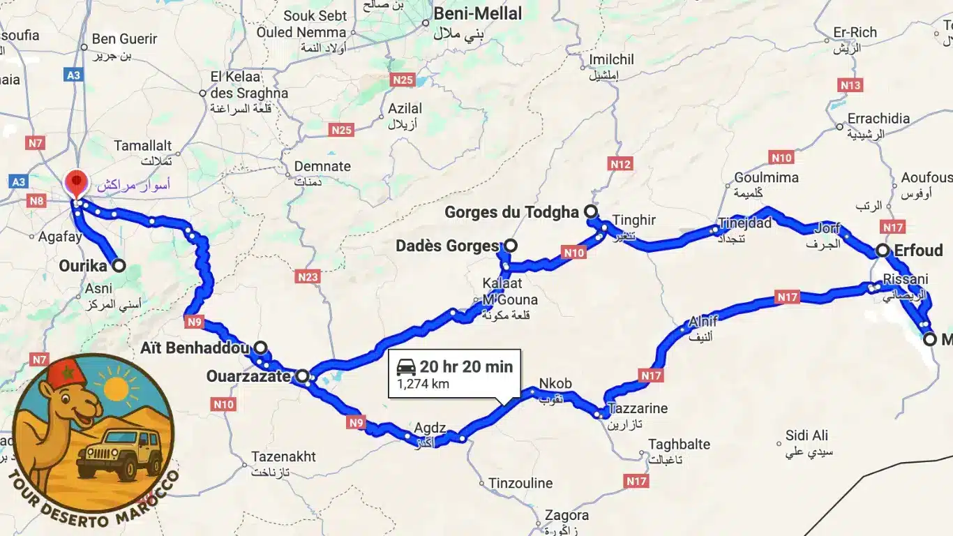 L’Itinerario Marrakech 7 Giorni è pensato per chi desidera vivere un’esperienza completa del Marocco, combinando cultura, natura e deserto. Questo tour include la visita della vibrante città di Marrakech, la scoperta delle Kasbah dell’Alto Atlante, i paesaggi della Valle del Dades e del Todra e l’emozione di una notte sotto le stelle nel deserto di Merzouga. Inoltre, l’itinerario prevede un’escursione nella Valle dell’Ourika, offrendo un perfetto equilibrio tra avventura e relax.