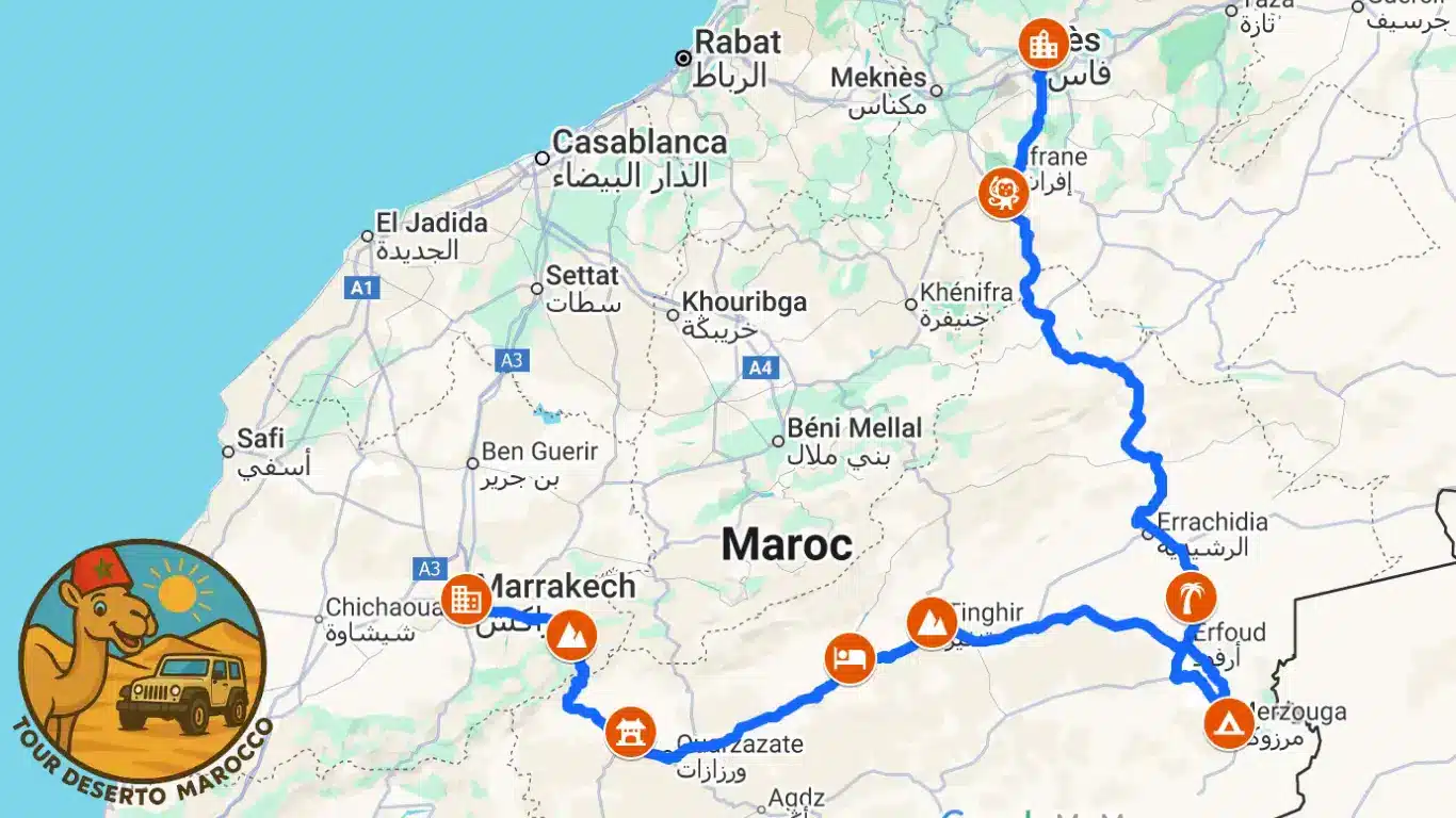 Il tour dura 7 giorni e 6 notti, includendo visite a Fès, Merzouga, le Gole del Todra, Ouarzazate, Kasbah Ait Ben Haddou e Marrakech, con esperienze nel deserto e visite culturali.